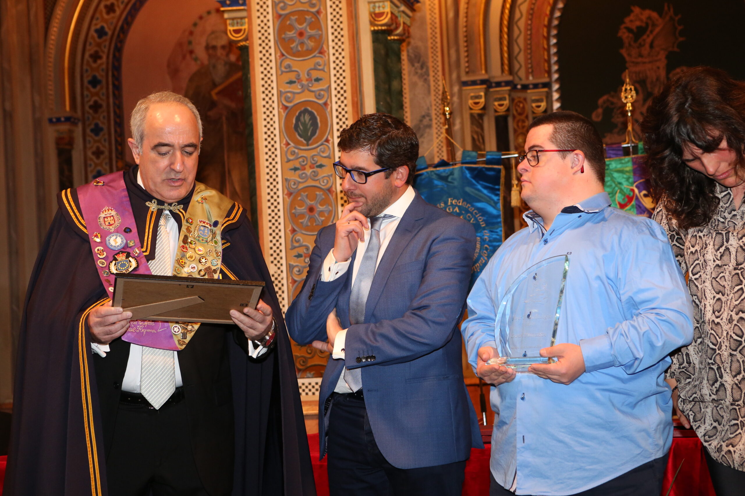 Carlos Martín, Presidente del Círculo, hizo la entrega del premio y certificado a dos usuarios y personas contratadas en el Campus Diversia, Miguel Hernández y Mª Carmen Escamilla, acompañados por Marcelino Arce, coordinador y responsable del Campus Diversia. También se les impuso la medalla de Cofrades del Círculo de Enófilos Utiel-Requena.